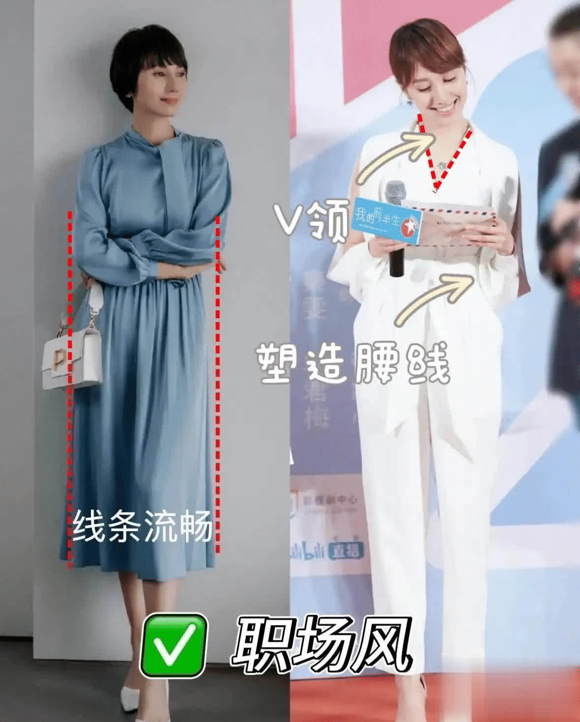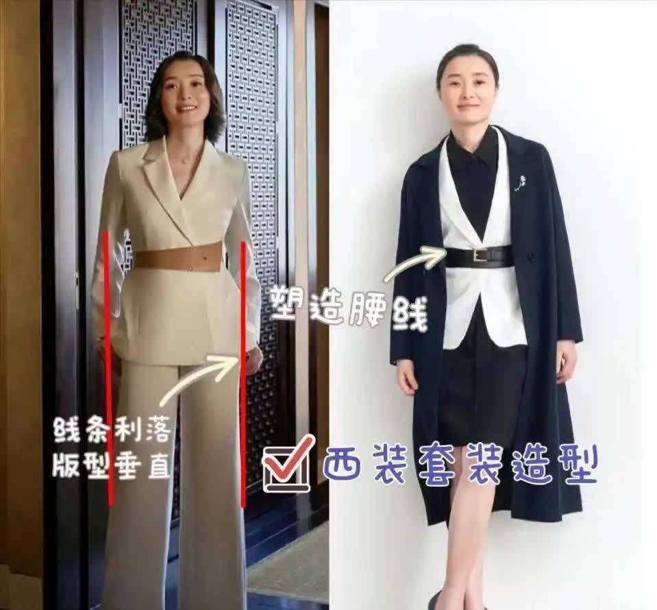袁泉的穿搭示范:连衣裙或者套装自带的腰线,巧妙展现出袁泉的完美比例,与短发结合的造型,显高又不失时尚感。
