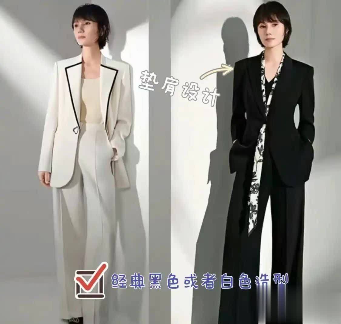 袁泉那修剪极短的超级短发,将她立体的五官和清澈的眼神完全凸显出来,气场十足。在职场中,她偏好搭配剪裁利落的西装套装,如米色、黑色等基础色的套装,内搭T恤或背心。短发的极致利落与西装线条的锐利感相得益彰,完美诠释现代职场女性的睿智与强大气场。