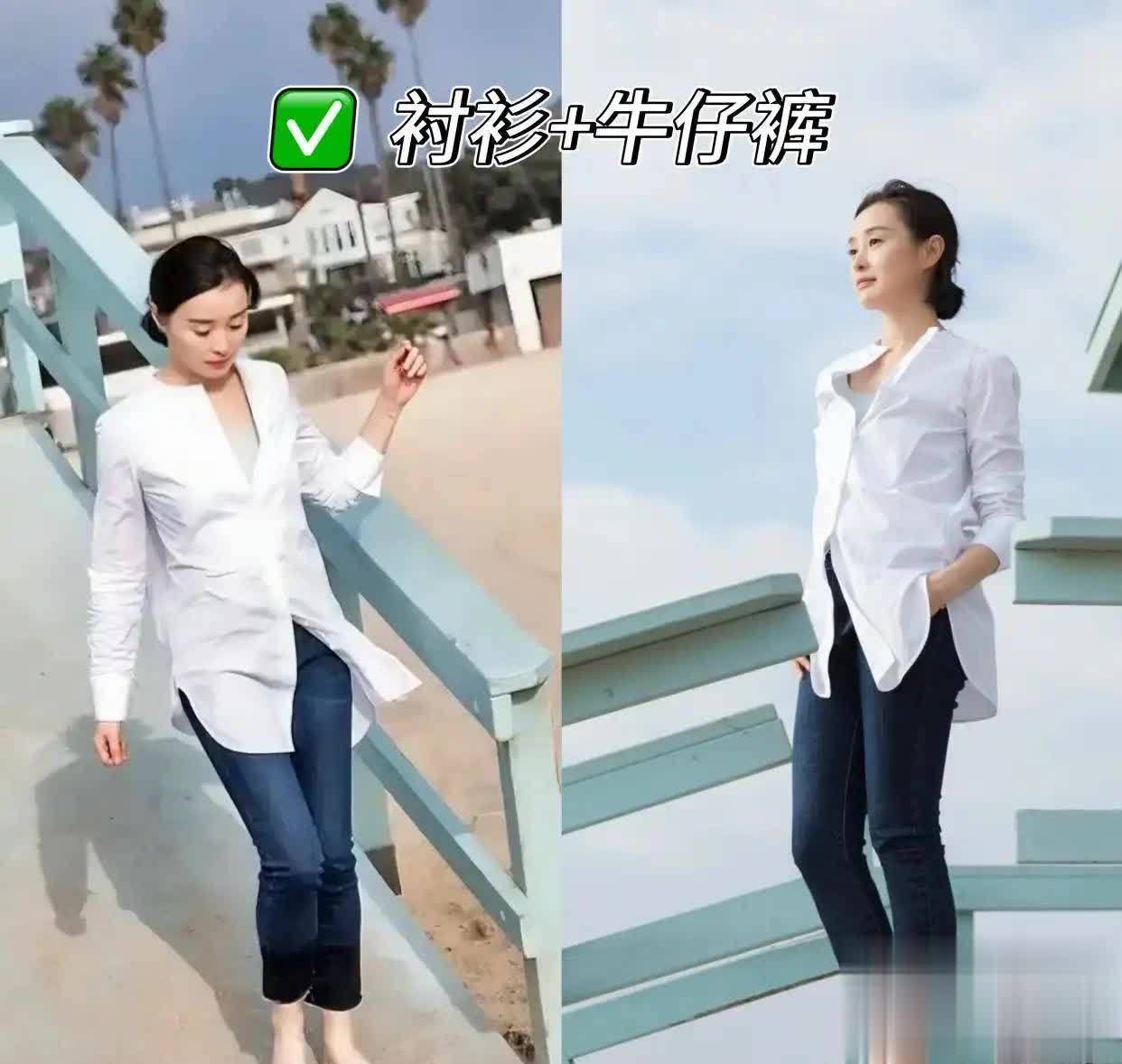 穿搭示范:袁泉用一件质感优良的纯棉白T恤或衬衫,搭配蓝色牛仔裤,干净利落的短发(如齐耳短发或及颌波波头)使整个造型重点突出,避免了“过于随便”的邋遢感,让人显得精神、清爽,自然减龄。值得借鉴。